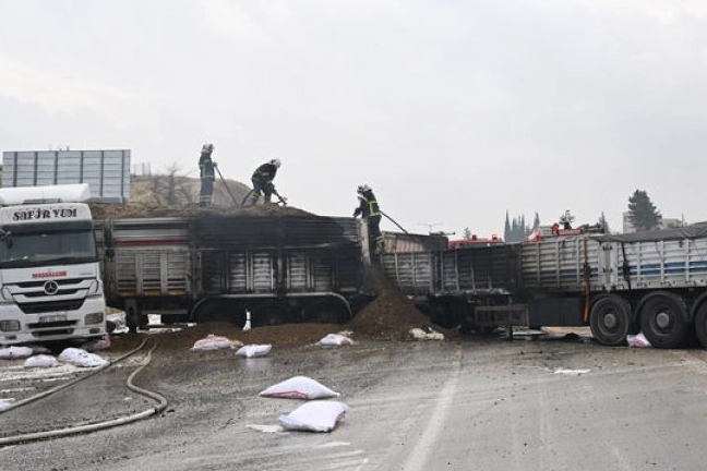 TAG Otoyolu’nun Gaziantep Batı Gişeleri yakınlarında meydana gelen kazada, plakaları ve sürücüleri henüz belirlenemeyen 3 TIR zincirleme şekilde çarpıştı. Çarpışmanın ardından araçlarda yangın çıktı.