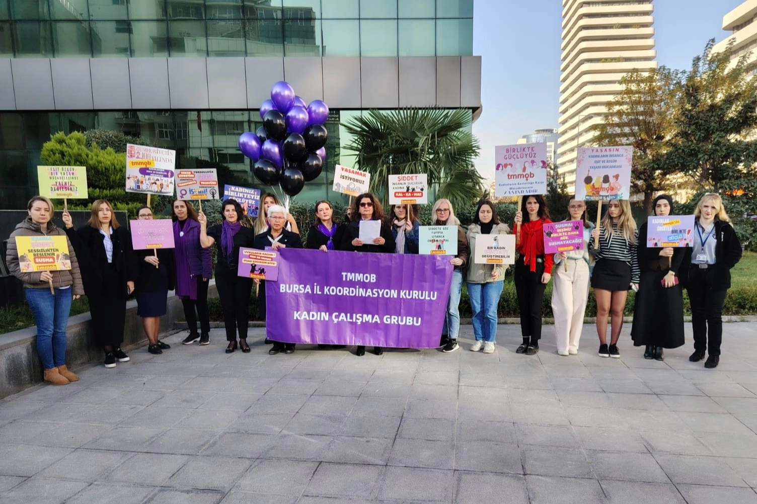 TMMOB Bursa İl Koordinasyon Kurulu Kadın Çalışma Grubu, 25 Kasım Kadına Yönelik Şiddete Karşı Uluslararası Mücadele Günü’nde BAOB Özgürlük ve Demokrasi Meydanı’nda basın açıklaması yaptı. Açıklamayı, TMMOB Bursa İKK Kadın Çalışma Grubu Temsilcisi Gülsemin Ayyıldız okudu.