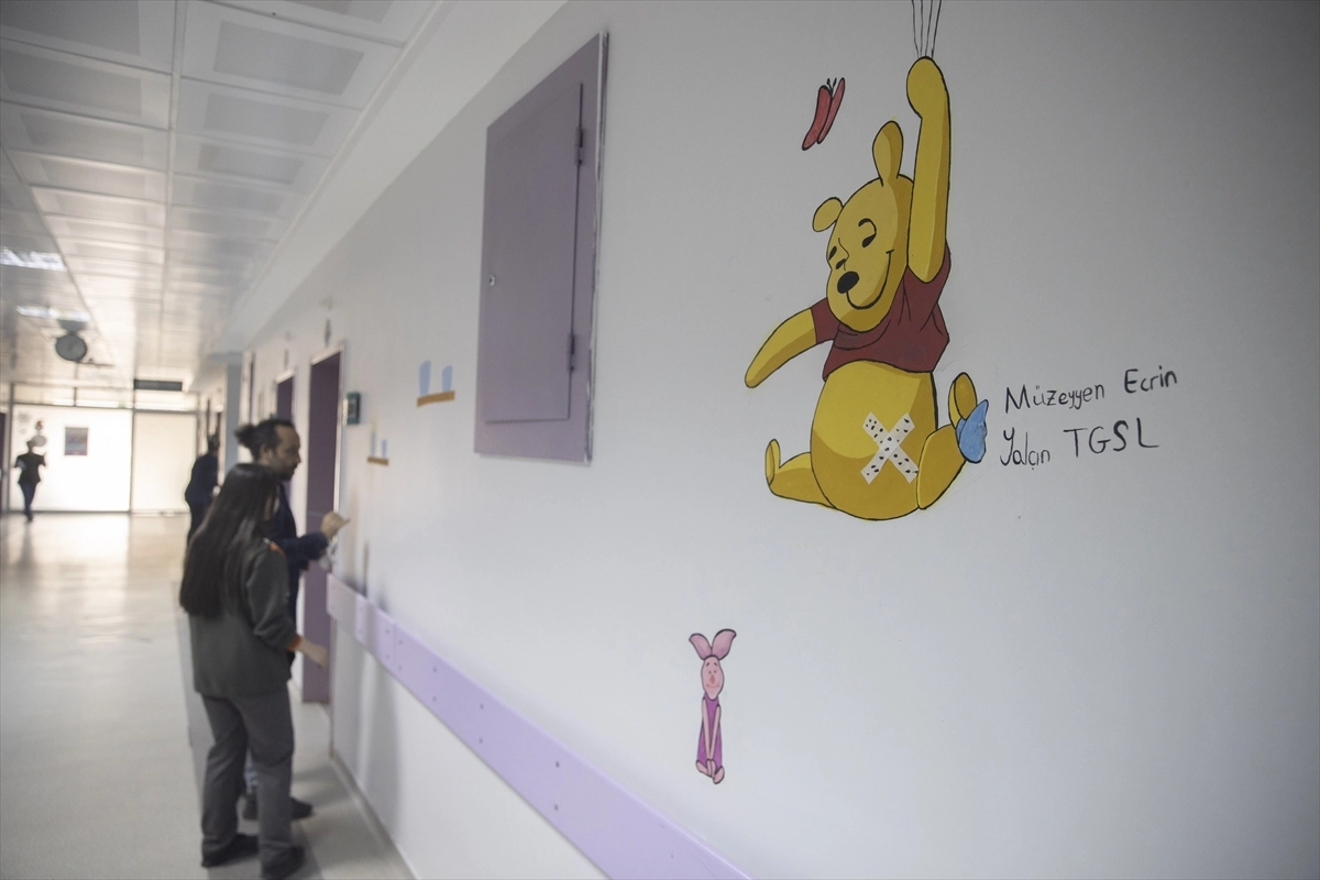Öğretmenleri ile hastaneye gelen öğrenciler, çocuk hastalıkları servisinin koridor duvarlarına çizgi film karakterlerini çizerek güzelleştirdi.