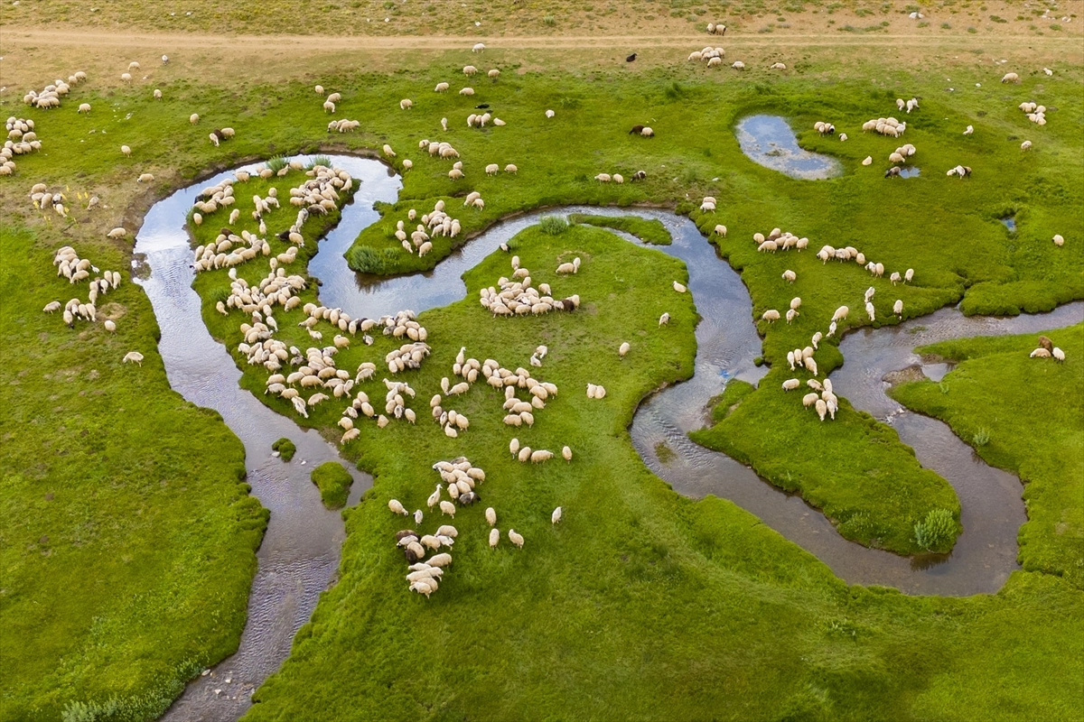 Sürülerin su kaynakları çevresinde otlatıldığı yayla, dronla görüntülendi.