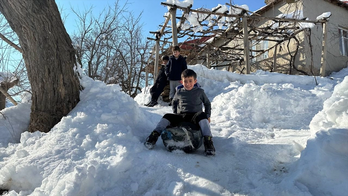 Çocuklar ise kızak ve bidonlarla kayarak karın keyfini çıkarıyor.