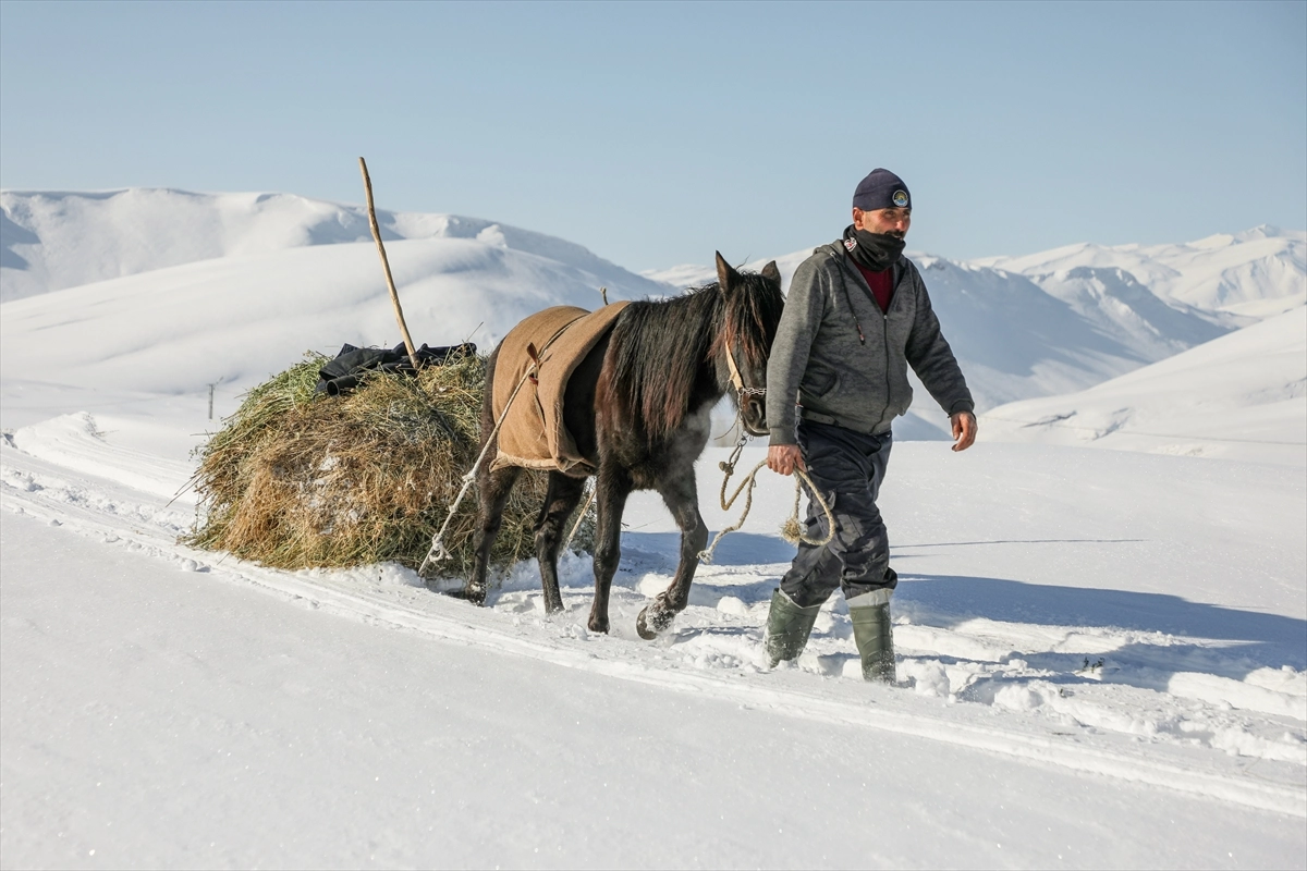 Kızak ya da yük hayvanları aracılığıyla taşıdıkları otu, ezdikleri kar örtüsünün üzerine sererek hayvanlarını besleyen hayvan sahipleri, bu işlemi günde 2-3 kez tekrarlıyor.