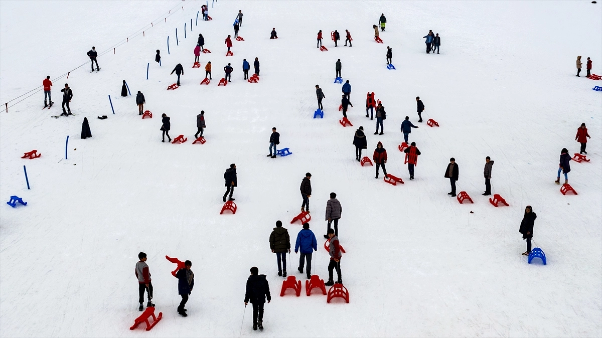 VAN (AA) - Van'ın Çaldıran ilçesindeki kayak merkezine giden öğrenciler, kızak ve kayak takımlarıyla kaydı, kar üstünde halay çekerek eğlendi.