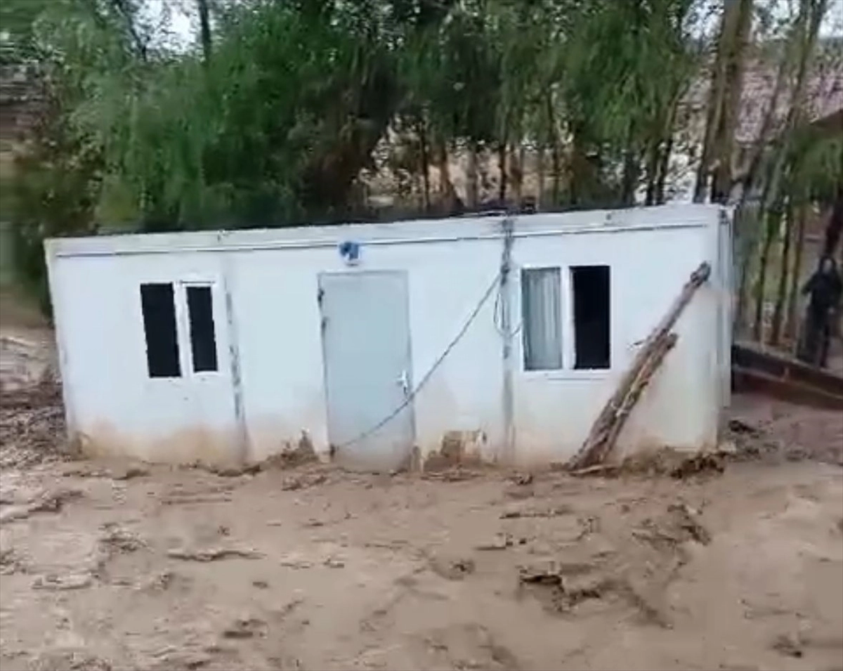 Aniden bastıran sağanak sonrası oluşan sel, 2020'de meydana gelen depremin ardından mahalleye kurulan boş konteynerleri sürükledi.