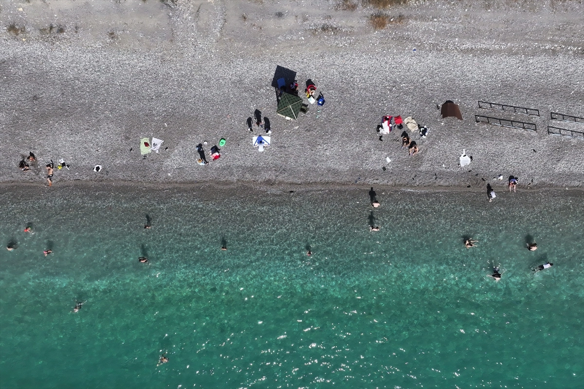 Hava sıcaklığının artmasıyla Mollakasım Halk Plajı'na gelenler, hem oluşturulan alanlarda piknik yapıyor hem de gölde yüzerek serinliyor.