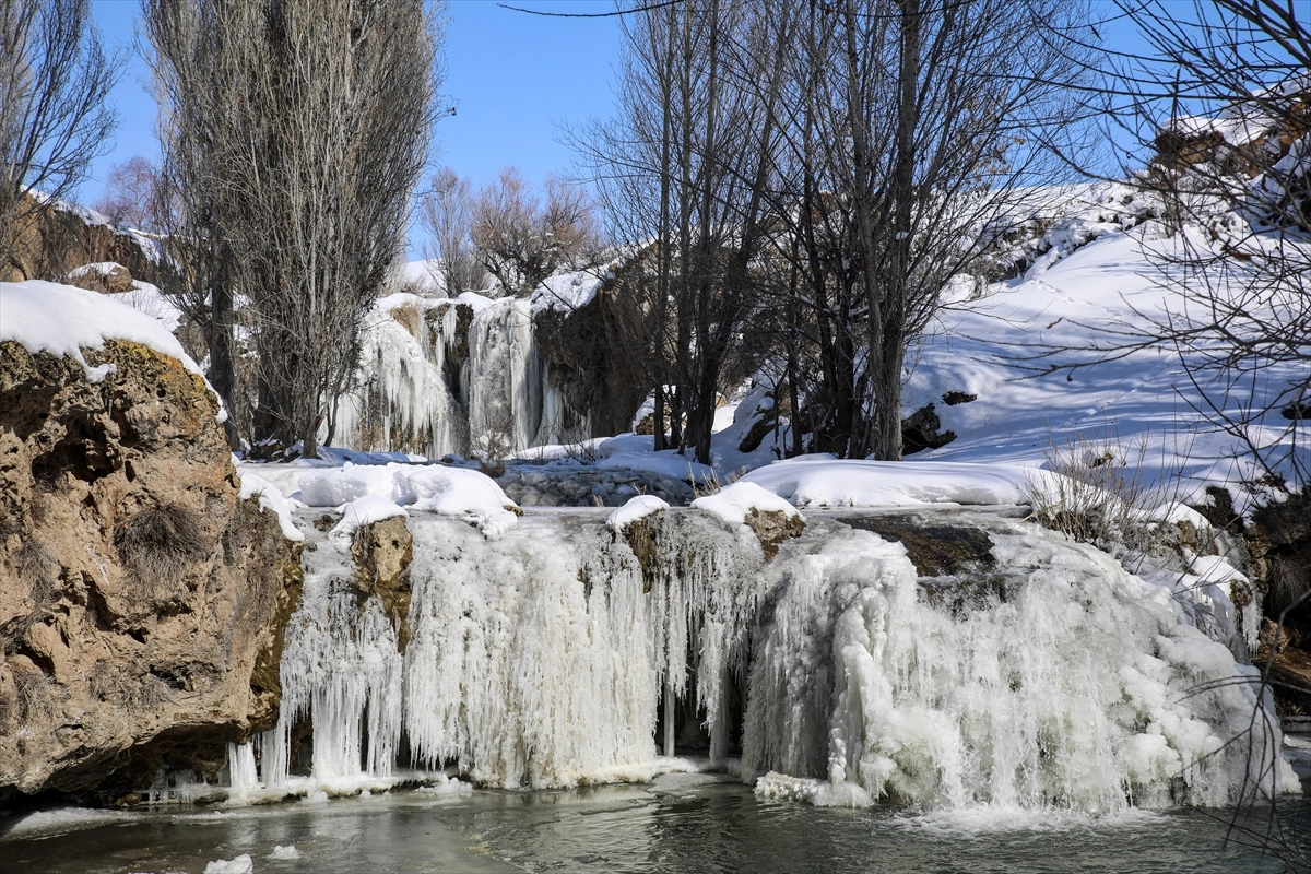 Hava sıcaklığının sıfırın altında 18 dereceye kadar düştüğü ilçede, kısmen buzla kaplanan şelaleye gelen vatandaşlar, kırağı düşen ağaçları, bembeyaz kar örtüsüyle oluşan manzarayı görüntülüyor.