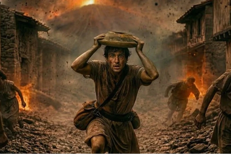 Kaçış anı yeniden canlandırıldı Porta Stabia yakınlarında bulunan kalıntılar, kurbanın kaçmaya çalışırken hayatını kaybettiğini gösteriyor. Yapay zeka ile oluşturulan sahnede, adamın gökten yağan volkanik taşlardan korunmak için başına bir kap tuttuğu görülüyor. Bu sahne, antik yazar Genç Plinius’un betimlemeleriyle de örtüşüyor.