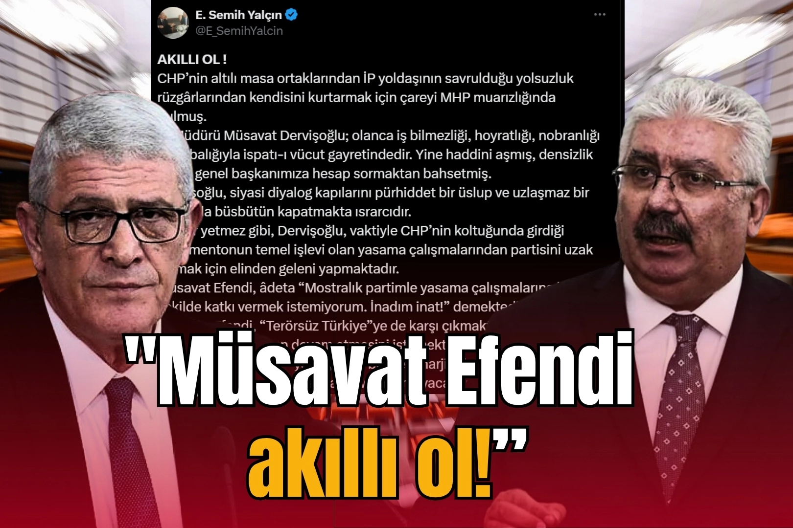MHP Genel Başkan Yardımcısı Semih Yalçın, İYİ Parti lideri Dervişoğlu'nun sözlerine X hesabından yaptığı açıklama ile cevap verdi. Yalçın, Dervişoğlu'nun siyasi diyalog kapılarını kapattığını ve "Terörsüz Türkiye" çalışmalarına da karşı çıktığını iddia etti. Yalçın, Dervişoğlu için "Müsavat Efendi akıllı ol!" diyerek, "pavyon kabadayısı kılıklı" ifadesini kullandı ve siyaset adabını öğrenmesi gerektiğini söyledi.