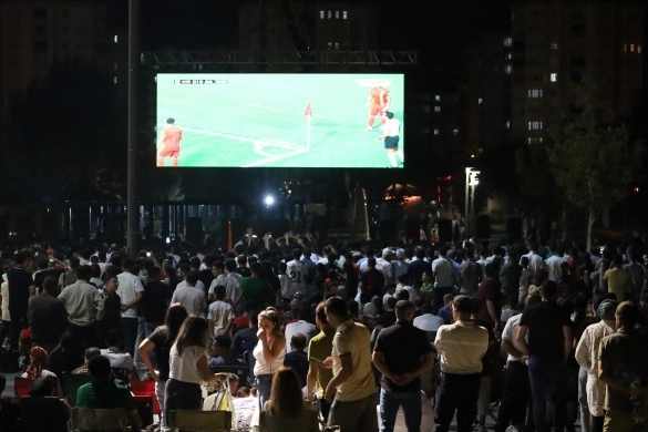 Amed Büyükşehir Belediyesi, taraftarların maçı takip edebilmesi için Kayapınar’daki Kent Meydanı’na dev ekran kurdu. Taraftarlar burada toplu halde karşılaşmayı izliyor.