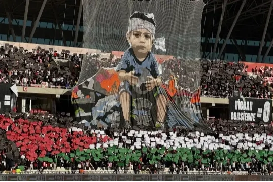 Maç öncesinde tribünlerde açılan koreografide, başı sarılı ve elinde futbol topu bulunan bir çocuğun görseli yer aldı. Koreografinin üzerinde ise “Dünya: 0 – Vicdan: 0” yazısı dikkat çekti. Tribünlerdeki bu anlar, cep telefonlarıyla görüntülenerek sosyal medyada paylaşıldı.