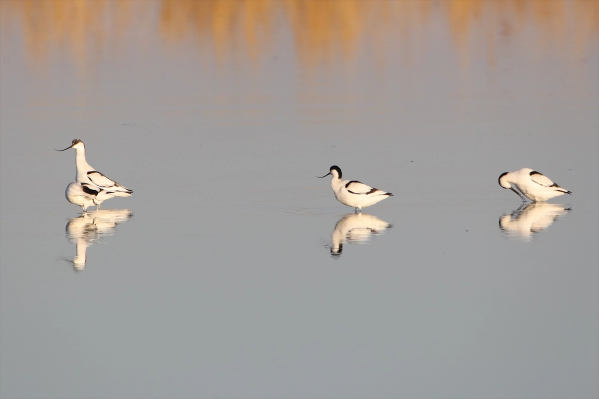 (recurvirostra avosetta) da yer alıyor. Kılıçgaga kuşları, sulak alanda beslenirken görüntülendi.