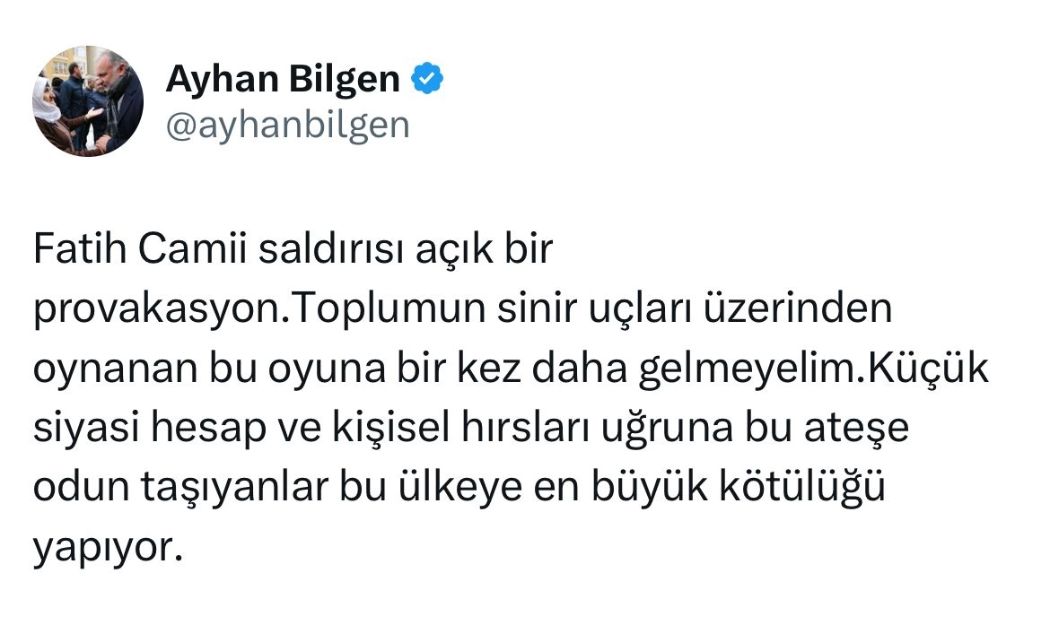 ''Fatih Camii saldırısı açık bir provakasyon. Toplumun sinir uçları üzerinden oynanan bu oyuna bir kez daha gelmeyelim. Küçük siyasi hesap ve kişisel hırsları uğruna bu ateşe odun taşıyanlar bu ülkeye en büyük kötülüğü yapıyor.''