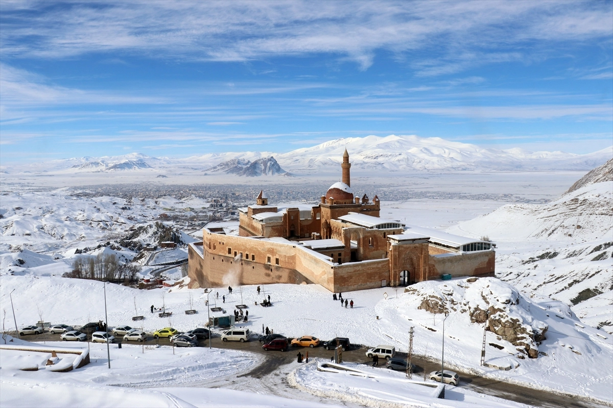İshak Paşa Sarayı ile çevresi karla kaplandı. Yaklaşık 2 bin metre yükseklikteki tepelik alanda bulunan saray, çevresindeki