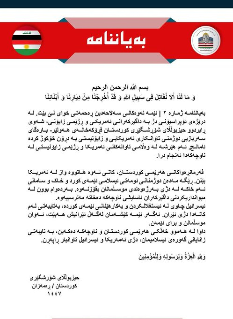 Ortadoğu’daki savaş atmosferi genişlerken, Irak Kürdistanı sahasında yeni bir silahlı yapılanmanın ortaya çıktığı iddia edildi. “Kürdistan Hizbullahı” adını kullanan bir grup, Irak Kürdistan Bölgesi’nde ABD ve İsrail’e karşı silah kuşandıklarını ilan ettiğini açıkladı.