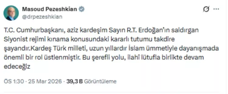 İran ile İsrail arasında 26 gündür süren savaşın yarattığı gerilim devam ederken, İran Cumhurbaşkanı Mesud Pezeşkiyan’dan Türkiye’ye yönelik dikkat çeken bir mesaj geldi. Sosyal medya üzerinden Türkçe paylaşım yapan Pezeşkiyan, Cumhurbaşkanı Recep Tayyip Erdoğan’ın İsrail’e yönelik tutumunu açık sözlerle övdü.