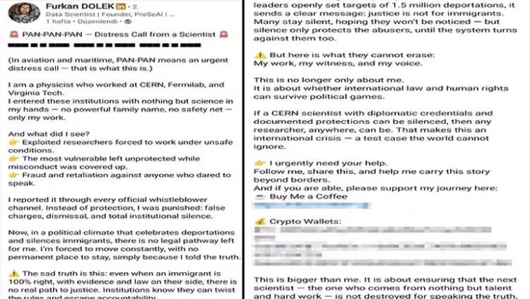Adana’nın Kozan ilçesinde yaşayan Dölek ailesi, dünyaca ünlü araştırma merkezlerinde görev yapan oğulları Dr. Furkan Dölek’in kaybolduğunu açıkladı. Dölek’in, ABD’nin Chicago kentindeki Fermilab’ta araştırma görevi yaptığı, burada tespit ettiği usulsüzlükleri bakanlığa bildirdiği ve sosyal medya hesabından paylaştığı öğrenildi.