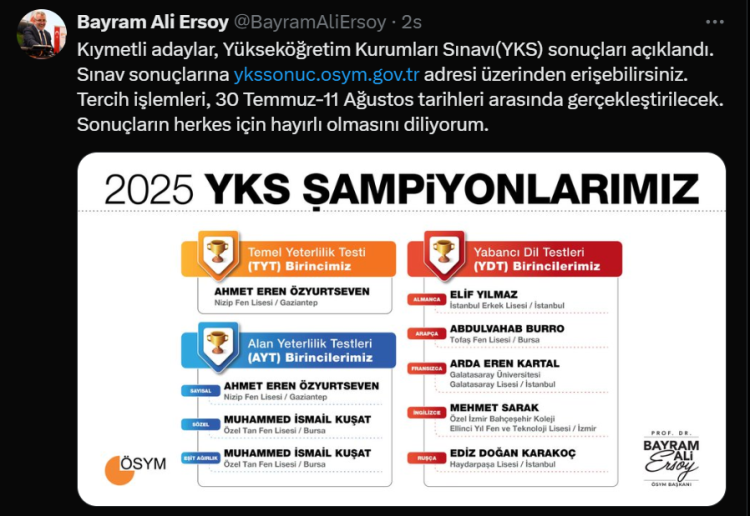 2025-YKS’de Temel Yeterlilik Testi (TYT) birinciliğini Gaziantep Nizip Fen Lisesi’nden Ahmet Eren Özyurtseven elde etti. Alan Yeterlilik Testleri'nde (AYT) sayısal alanda yine Ahmet Eren Özyurtseven, sözel ve eşit ağırlık alanlarında ise Bursa Özel Tan Fen Lisesi’nden Muhammed İsmail Kuşat birinci oldu.
