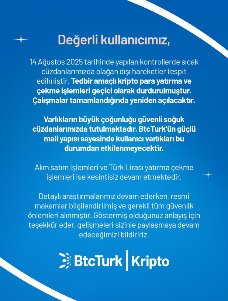 14 Ağustos 2025’te yapılan rutin kontroller sırasında sıcak cüzdanlarda olağandışı hareketler tespit eden BtcTurk, tedbir amaçlı olarak kripto para yatırma ve çekme işlemlerini durdurdu.