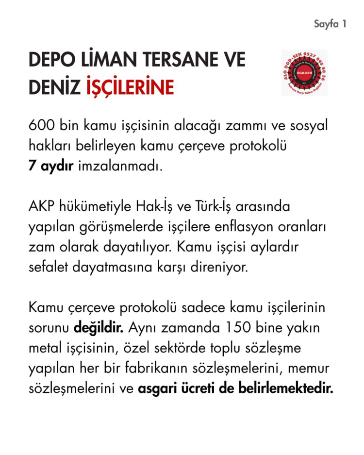Depo, Liman, Tersane ve Deniz İşçileri Sendikası (DGD-SEN), 600 bin kamu işçisinin zam ve sosyal haklarını belirleyecek olan kamu çerçeve protokolünün 7 aydır imzalanmamasına yönelik bir açıklama yayımladı. Sendika, AK Parti hükümeti ile Hak-İş ve Türk-İş arasında süren görüşmelerde işçilere enflasyon oranlarının zam olarak dayatıldığını belirterek bu uygulamaya karşı mücadele çağrısında bulundu.
