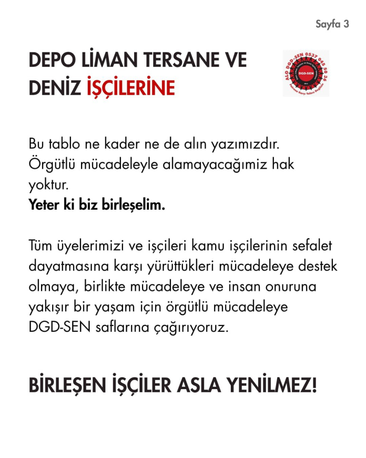 Sendika, örgütlü mücadeleyle işçilerin haklarına kavuşabileceğini vurgularken, tüm üyelerini ve işçileri DGD-SEN saflarına davet etti. “Bu tablo kaderimiz değil. Yeter ki biz birleşelim” denilen açıklamada, “Birleşen işçiler asla yenilmez” sloganıyla dayanışma çağrısı yapıldı.