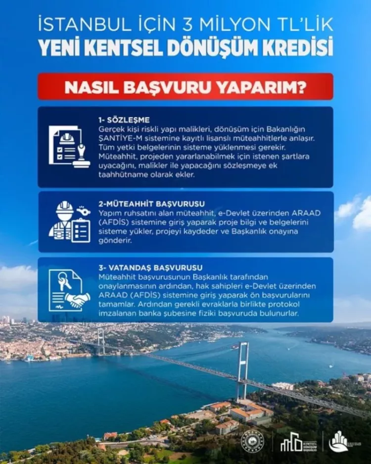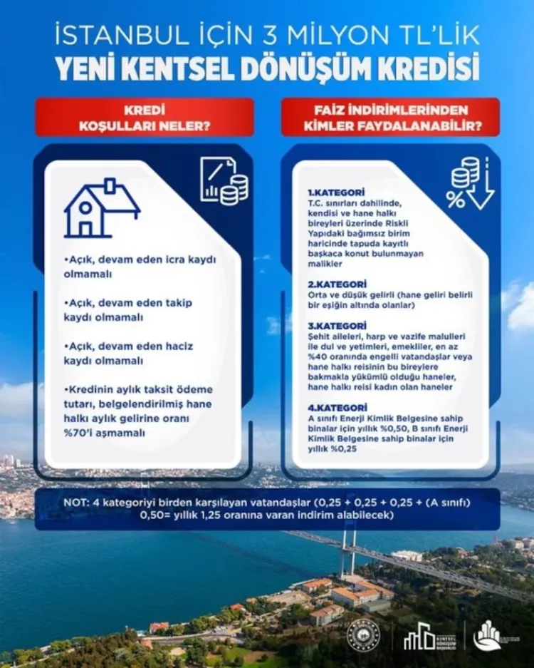 İstanbul’da riskli yapıların yenilenmesi amacıyla hayata geçirilen kentsel dönüşüm kredisi için başvurular başladı. Program kapsamında yurttaşlara hibe, taşınma yardımı ve uzun vadeli kredi imkânları sunuluyor.