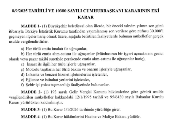 9 Eylül 2025 tarihli Resmi Gazete’de yayımlanan karar doğrultusunda, büyükşehir belediyesi çatısı altında yer alan ve nüfusu 30 bini geçen ilçelerde bulunan esnaflar artık basit usul kapsamında vergilendirilemeyecek.