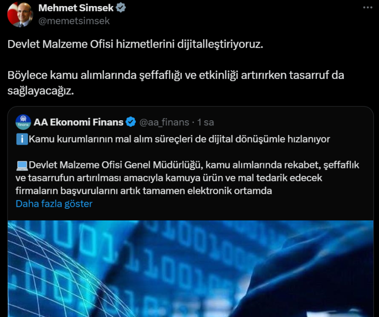 Bakan Şimşek, yaptığı açıklamada Devlet Malzeme Ofisi’nin dijitalleşme sürecine değinerek şunları söyledi: