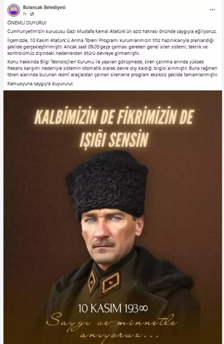 “Cumhuriyetimizin kurucusu Gazi Mustafa Kemal Atatürk’ün aziz hatırası önünde saygıyla eğiliyoruz. İlçemizde 10 Kasım Atatürk’ü Anma Töreni, planlandığı şekilde gerçekleştirilmiştir. Ancak saat 09.05’te çalması gereken genel siren sistemi, teknik ve kontrolümüz dışındaki nedenlerden ötürü devreye girmemiştir. Bilgi Teknolojileri Kurumu ile yapılan görüşmede, siren çalınma anında yüksek frekans karışımı nedeniyle sistemin otomatik olarak devre dışı kaldığı bilgisi alınmıştır. Buna rağmen tören alanındaki resmi araçlardan çalınan sirenlerle program eksiksiz tamamlanmıştır.”
