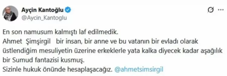 Açıklamaların ardından Ayçin Kantoğlu sosyal medyada sert tepki gösterdi. “En son namusum kalmıştı laf edilmedik” diyerek Şimşirgil’i ağır bir dille eleştiren Kantoğlu, “Sizinle hukuk önünde hesaplaşacağız” ifadelerini kullandı.