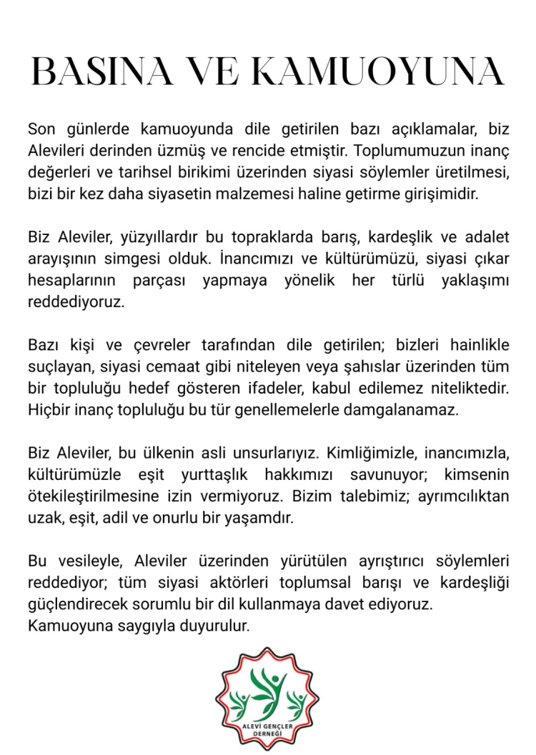 “Son günlerde kamuoyunda dile getirilen bazı açıklamalar, biz Alevileri derinden üzmüş ve rencide etmiştir. Toplumumuzun inanç değerleri ve tarihsel birikimi üzerinden siyasi söylemler üretilmesi, bizi bir kez daha siyasetin malzemesi haline getirme girişimidir.”