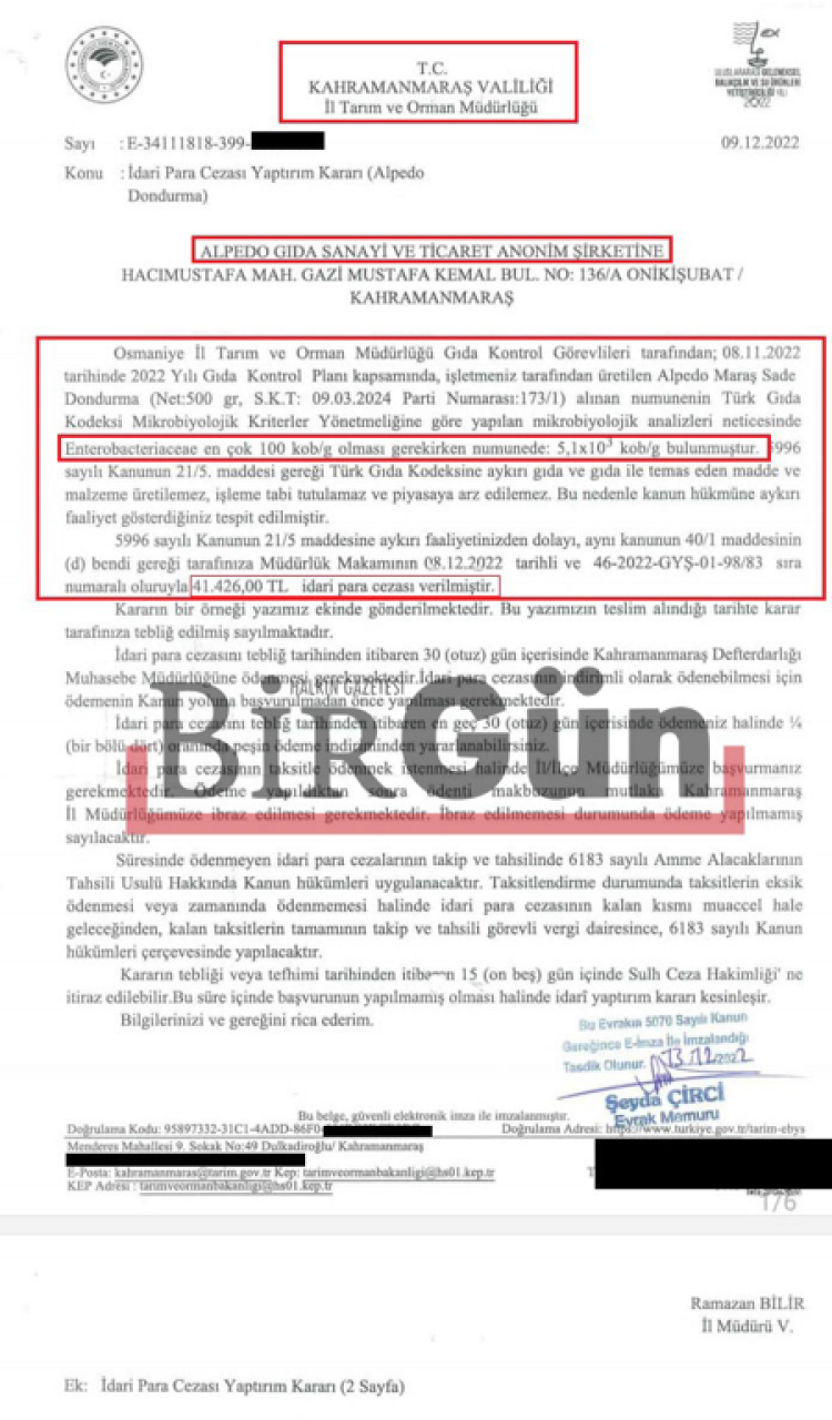 Osmaniye İl Tarım ve Orman Müdürlüğü’nün 2022’de yaptığı analizde, Alpedo’nun “Maraş Sade Dondurma” numunesinde gram başına 5 bin 100 Enterobacteriaceae tespit edildi. Yönetmelikte izin verilen sınırın 100 bakteri olduğu belirtilirken, ürünün 51 kat fazla yük taşıdığı belirlendi.
