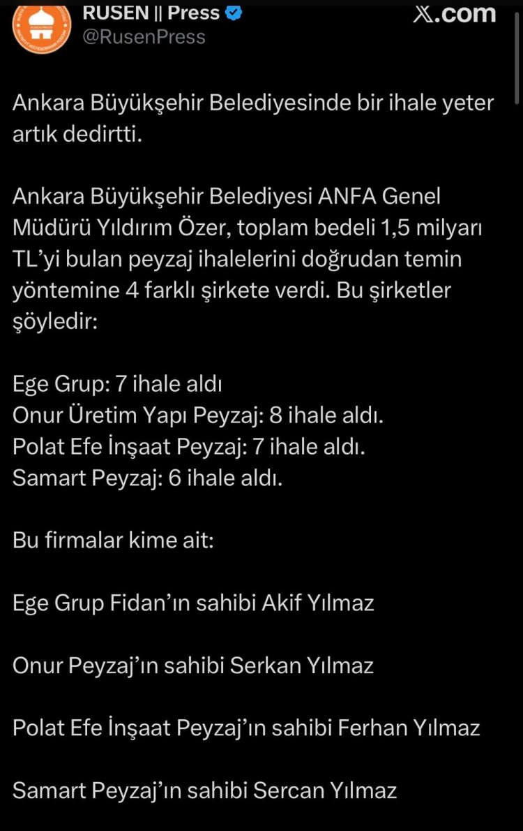“Büyükşehir Belediyesi’yle ilgili elinde bilgi veya belgesi olanlar, Ankara Cumhuriyet Başsavcılığı’nın 2025/246444 hz. dosyasına bildirsinler. Bunu yapmayıp ima yoluyla dahi olsa çalışanlarımız hakkında bu tür paylaşımlar yapanlar hakkında yasal işlemler başlatılacaktır.”
