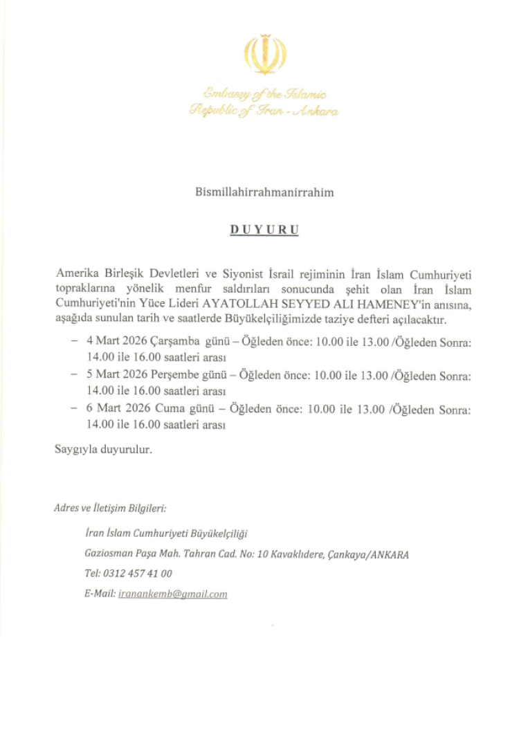 İran’ın Ankara Büyükelçiliği tarafından yapılan duyuruda, ABD ve İsrail’in İran topraklarına yönelik saldırıları sonucu hayatını kaybeden İran İslam Cumhuriyeti’nin üst düzey yetkilileri için taziye defteri açıldığı bildirildi. Büyükelçilikte açılan defterin üç gün boyunca ziyaretçilere açık olacağı duyuruldu.