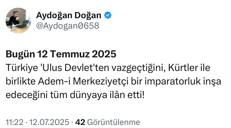 İnsan hakları aktivisti ve siyasetçi Aydoğan Doğan Cumhurbaşkanı Recep Tayyip Erdoğan'ın açiklamaları sonrası X hesabından yaptığı paylaşımda ULUS DEVLET'in an itibariyle bittiğini ve Türkiye'nin Adem-i Merkeziyetçi bir imparatorluk modelini tüm dünyaya ilan ettiğini yazdı. Doğan ; '' Devlet siyasetçilere ve topluma yeni bir görev yeni bir hedef verdi. Yeni bir imparatorluk inşası hedefi. Siyasetçiler bu görevi kabul edecek etmeyenler yok olacak, toplum da buna ikna olacak! Bugün yeni bir dönemin başlangıcıdır. Özellikle Kürt ve Arap vurgusu ile Batı'ya, Sykes Picot'a , Lozan'a da cesurca ve resmi olarak bir meydan okuma yapılmıştır"
