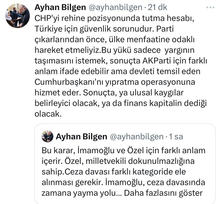 25,26,27. Dönem Kars Milletvekili ve Kars Belediye Başkanı Ayhan Bilgen kurultay davasına ilişkin; Bu karar, İmamoğlu ve Özel için farklı anlam içerir. Özel, milletvekili dokunulmazlığına sahip.Ceza davası farklı kategoride ele alınması gerekir. İmamoğlu, ceza davasında zamana yayma yolunu tercih ederse, parti içi tartışma büyük zarar verir.Yani aşağı tükürsen sakal, yukarı tükürsen bıyık! CHP'yi rehine pozisyonunda tutma hesabı, Türkiye için güvenlik sorunudur. Parti çıkarlarından önce, ülke menfaatine odaklı hareket etmeliyiz.Bu yükü sadece yargının taşımasını istemek, sonuçta AKParti için farklı anlam ifade edebilir ama devleti temsil eden Cumhurbaşkanı'nı yıpratma operasyonuna hizmet eder. Sonuçta, ya ulusal kaygılar belirleyici olacak, ya da finans kapitalin dediği olacak, dedi.