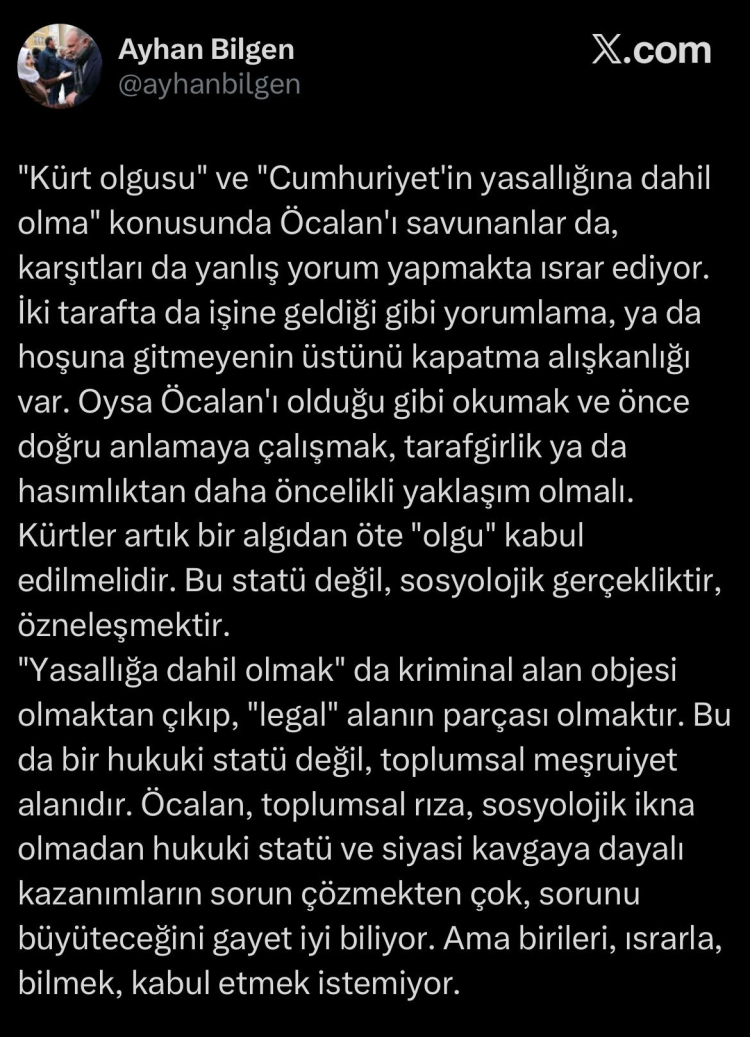 Ayhan Bilgen, sosyal medya hesabından yaptığı paylaşımda “Kürt olgusu” ve Abdullah Öcalan’ın Cumhuriyet’in yasallığına dahil olma yaklaşımı üzerine değerlendirmelerde bulundu.