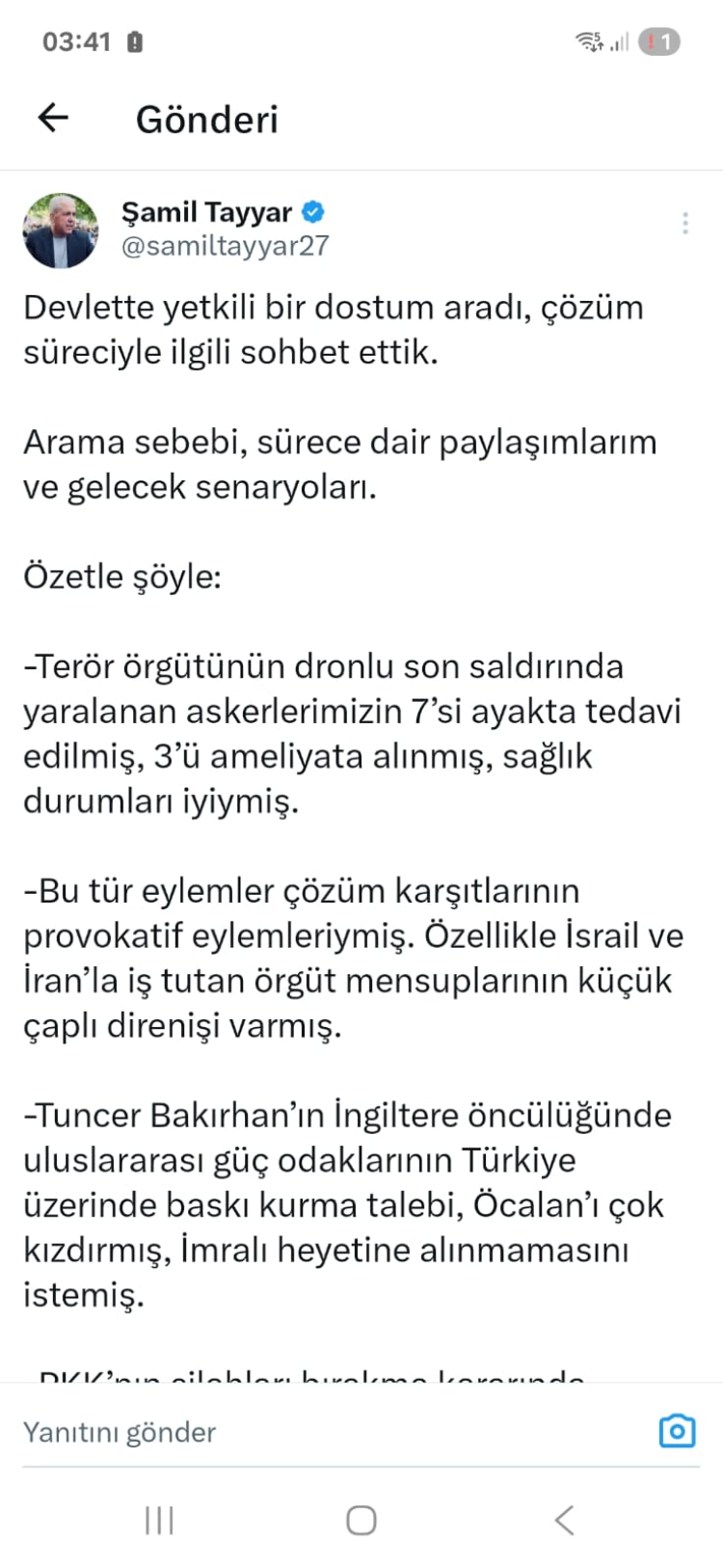 Şamil Tayyar paylaşımında ayrıca silah bırakma süreci ile ilgili de çarpıcı bilgilere yer verdi.