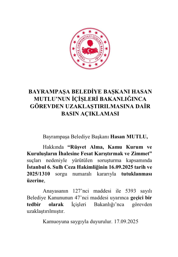 İçişleri Bakanlığı, Bayrampaşa Belediye Başkanı Hasan Mutlu’nun görevden uzaklaştırıldığını açıkladı.