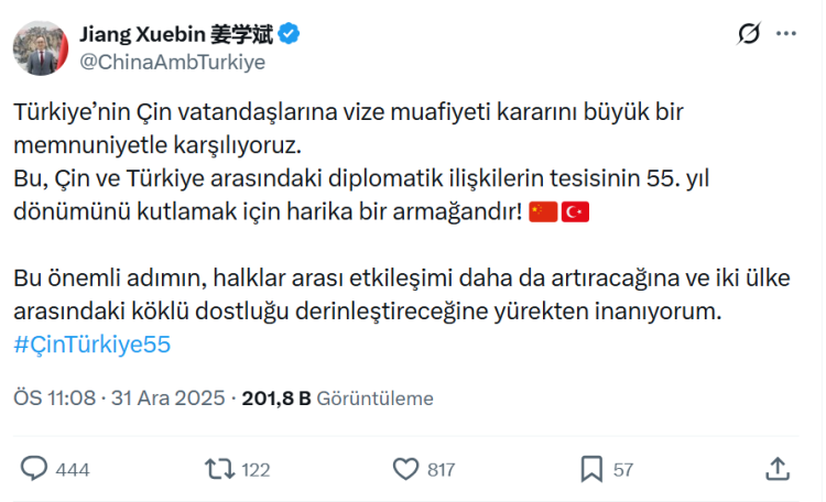 Çin’in Ankara Büyükelçisi Jiang Xuebin, kararın ardından sosyal medya hesabından yaptığı açıklamada, vize muafiyetini “büyük bir memnuniyetle” karşıladıklarını belirtti. Xuebin, bu adımın Çin ile Türkiye arasındaki diplomatik ilişkilerin tesisinin 55. yıl dönümüne denk gelmesinin anlamlı olduğunu vurguladı.