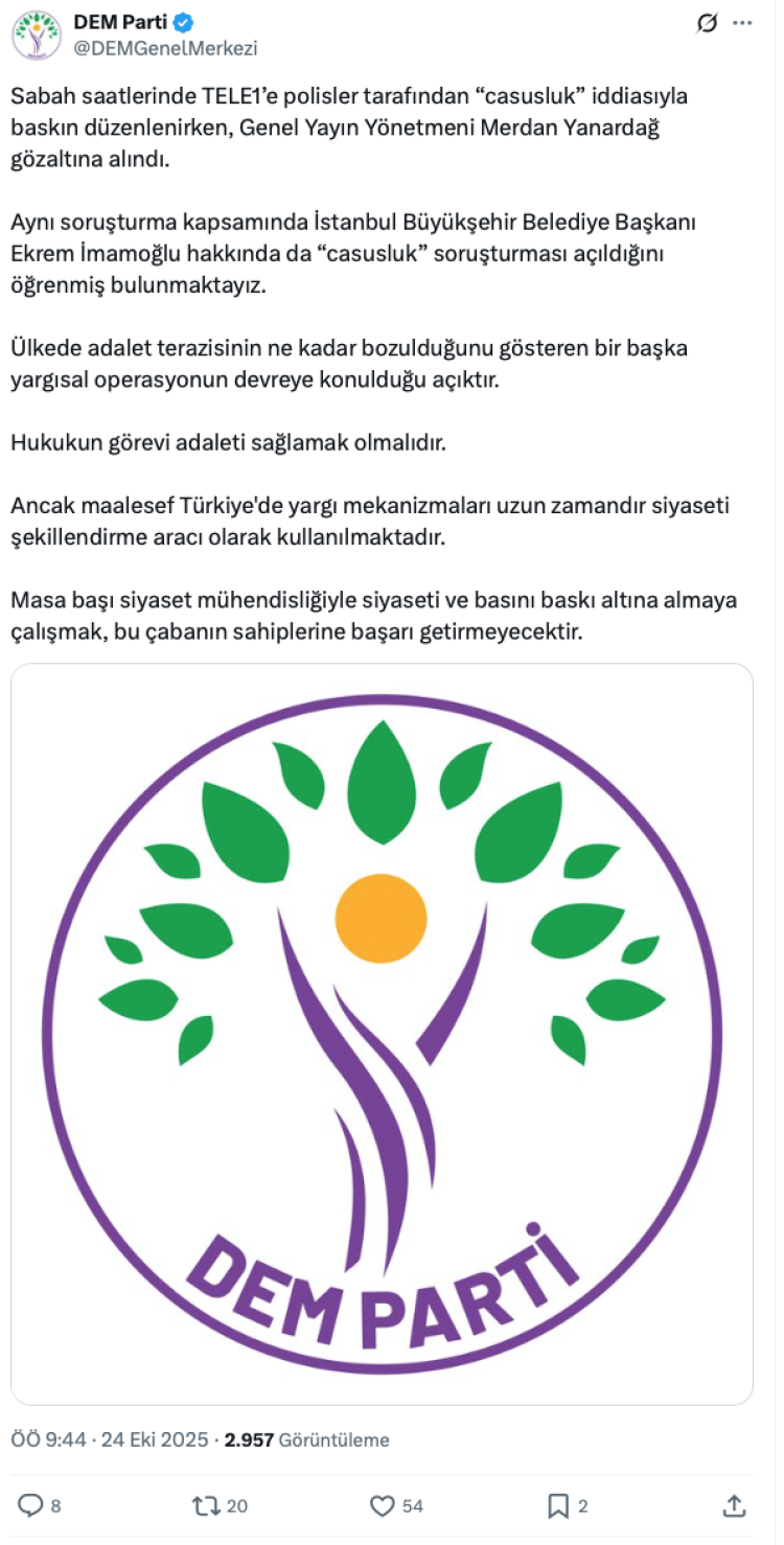 “Sabah saatlerinde TELE1’e polisler tarafından ‘casusluk’ iddiasıyla baskın düzenlenirken, Genel Yayın Yönetmeni Merdan Yanardağ gözaltına alındı. Aynı soruşturma kapsamında İstanbul Büyükşehir Belediye Başkanı Ekrem İmamoğlu hakkında da ‘casusluk’ soruşturması açıldığını öğrenmiş bulunmaktayız.