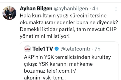 AKP'nin YSK temsilcisi Recep Özel, YSK’nın verdiği kararı asliye ceza mahkemesi ya da ağır ceza mahkemesinin bozamayacağını söyleyerek“Bozarsa çok, çok yanlış olur” dedi. Ayhan Bilgen ise X hesabından bu habere çarpıcı bir yorum yaptı. Ayhan Bilgen : ''Hala kurultayın yargı sürecini tersine okumakta ısrar edenler buna ne diyecek? Demek ki iktidar partisi, tam mevcut CHP yönetimini mi istiyor!''