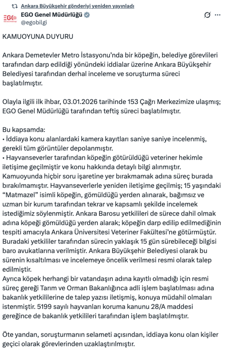 Ankara’da kamuoyuna yansıyan hayvan hakları iddialarının ardından Ankara Büyükşehir Belediyesi ve EGO Genel Müdürlüğü, Demetevler Metro İstasyonu’nda yaşandığı öne sürülen olaya ilişkin sürecin titizlikle sürdürüldüğünü açıkladı. Belediyeden yapılan duyuruda, ilk ihbarın 3 Ocak 2026 tarihinde 153 Çağrı Merkezi’ne ulaştığı ve bunun üzerine derhal teftiş sürecinin başlatıldığı belirtildi.