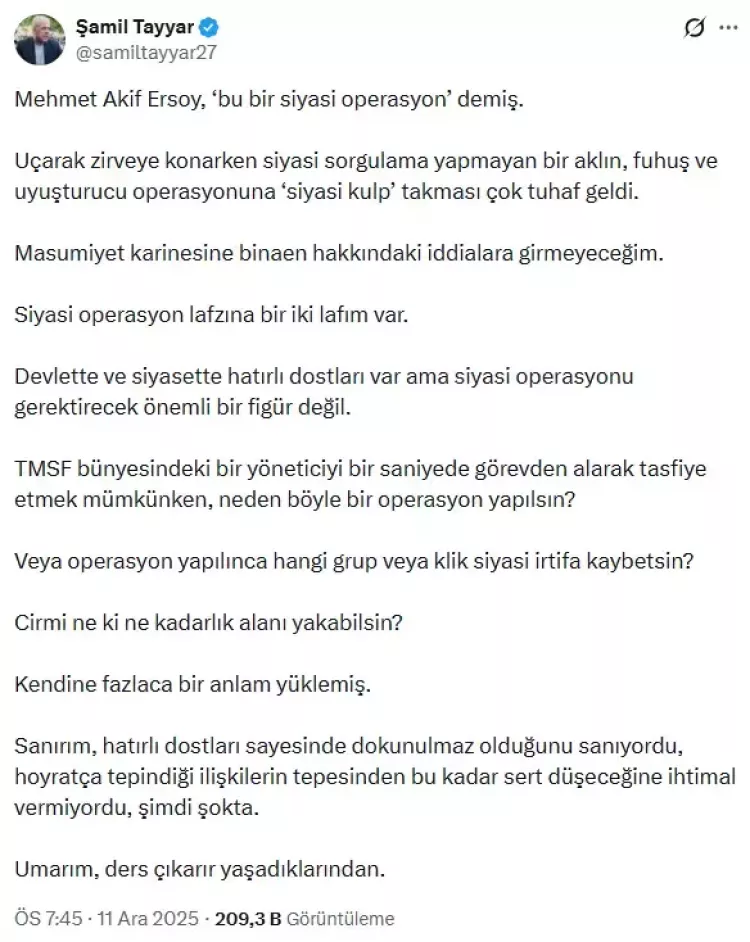 Ersoy'un bu savunması üzerine sosyal medya hesabından bir açıklama yapan Şamil Tayyar, Ersoy'un "siyasi operasyon" tezini sert bir dille çürüttü. Tayyar, Ersoy'un siyasi bir operasyona hedef olacak kadar önemli bir figür olmadığını savunarak şu ifadeleri kullandı: