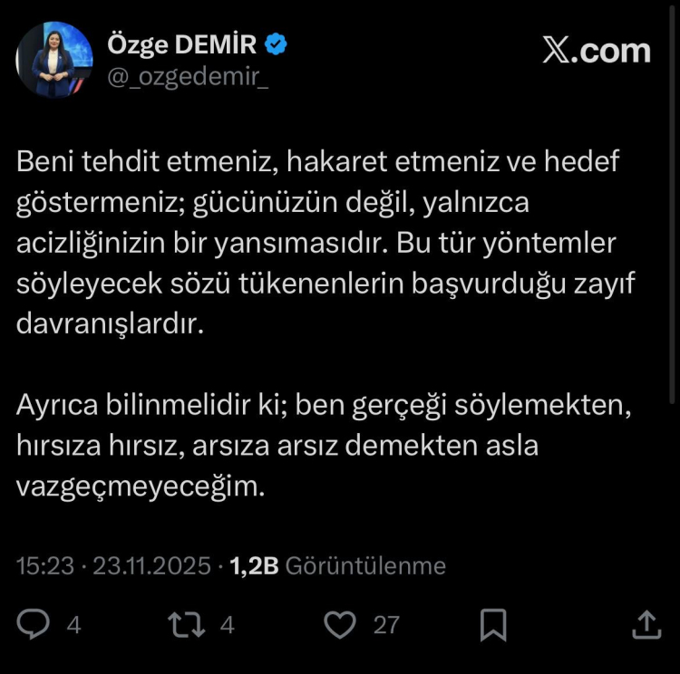 “Beni tehdit etmeniz, hakaret etmeniz ve hedef göstermeniz; gücünüzün değil, yalnızca acizliğinizin bir yansımasıdır. Bu tür yöntemler söyleyecek sözü tükenenlerin başvurduğu zayıf davranışlardır.”