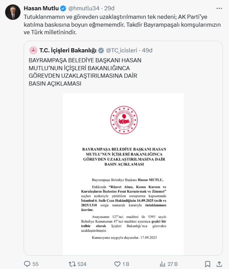 Mutlu paylaşımında, “Tutuklanmamın ve görevden uzaklaştırılmamın tek nedeni; AK Parti’ye katılma baskısına boyun eğmememdir. Takdir Bayrampaşalı komşularımızın ve Türk milletinindir” dedi.