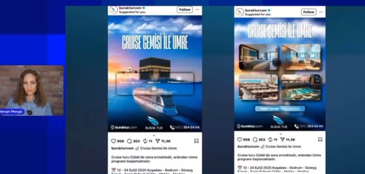 Gazeteci Nevşin Mengü, YouTube canlı yayınında hutbenin ilgili bölümünü okurken ekranda “cruise gemisi ile umre” reklamının belirdiğini gösterdi. Mengü, “Tam Diyanet’in dediğine uyuyor. Hem tatil, hem ibadet. Tabii zenginseniz” diyerek, hutbe ile lüks ibadet turları arasındaki ironiyi vurguladı.