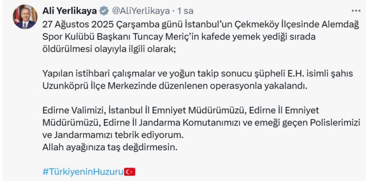 İçişleri Bakanı Ali Yerlikaya, İstanbul Çekmeköy’de Alemdağ Spor Kulübü Başkanı Tuncay Meriç’in öldürülmesiyle ilgili operasyonun detaylarını açıkladı. Yerlikaya, şüpheli E.H.’nin Edirne’nin Uzunköprü ilçesinde yakalandığını duyurdu.
