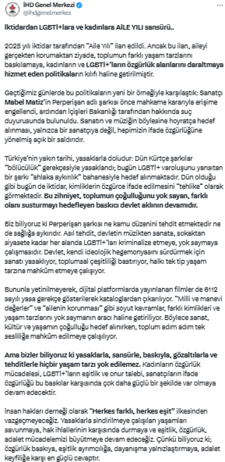İHD açıklamasında, son olarak sanatçı Mabel Matiz’in Perperişan adlı şarkısının mahkeme kararıyla erişime engellenmesi ve ardından İçişleri Bakanlığı tarafından suç duyurusunda bulunulmasına dikkat çekildi. Dernek, bu durumu yalnızca bir sanatçının değil, herkesin ifade özgürlüğüne yönelmiş açık bir saldırı olarak nitelendirdi.