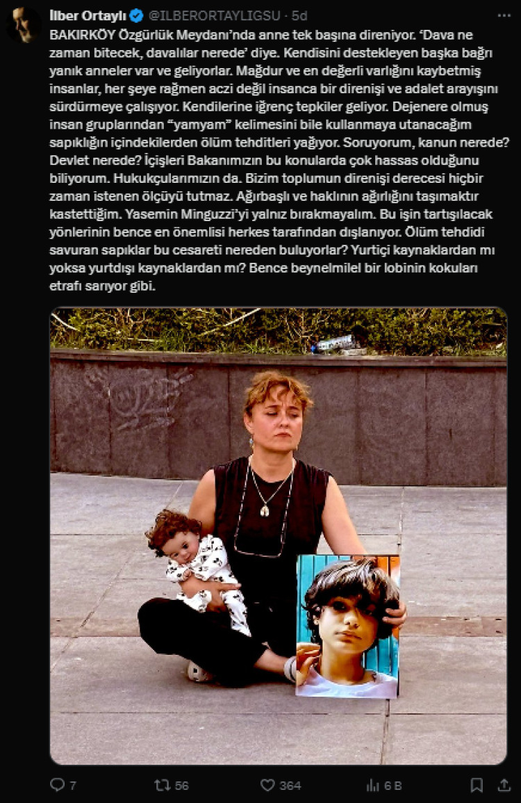 Prof. Dr. İlber Ortaylı, İtalya'da öldürülen Mattia Ahmat Minguzzi'nin annesi Yasemin Minguzzi'nin Bakırköy Özgürlük Meydanı'nda adalet arayışını destekliyor. Ortaylı, sosyal medyadaki tehditlere dikkat çekerek toplumdan Yasemin'i yalnız bırakmama çağrısı yaptı.