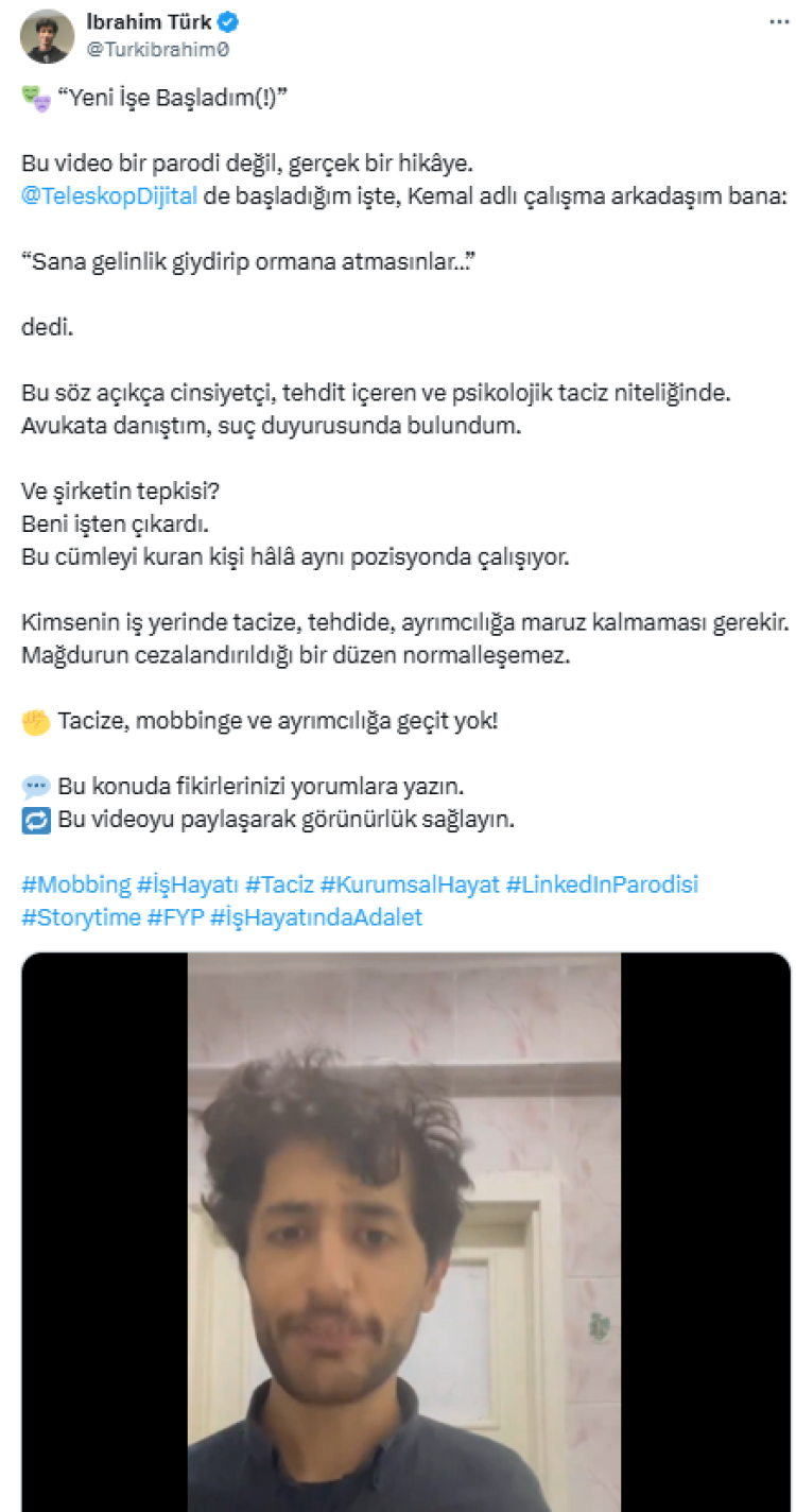 İbrahim Türk, resmi X hesabında yaptığı paylaşımda, çalışmaya başladığı şirkette bir çalışma arkadaşının kendisine,